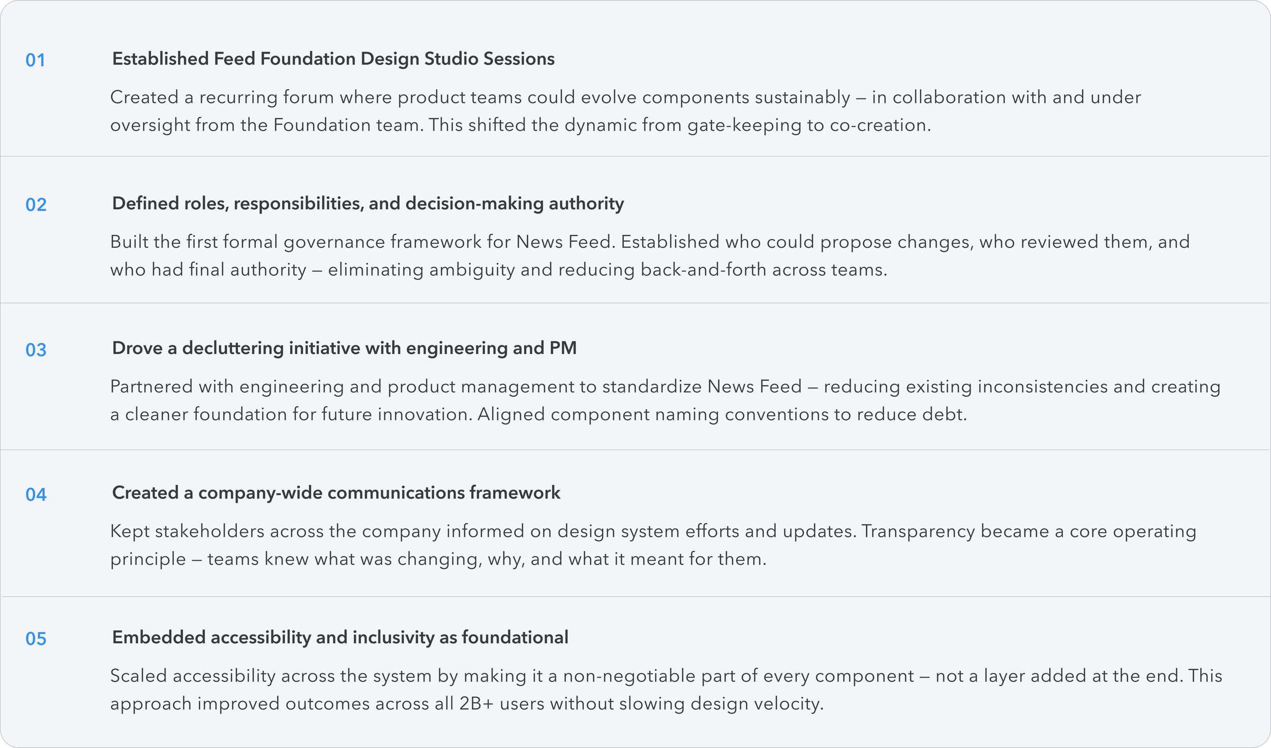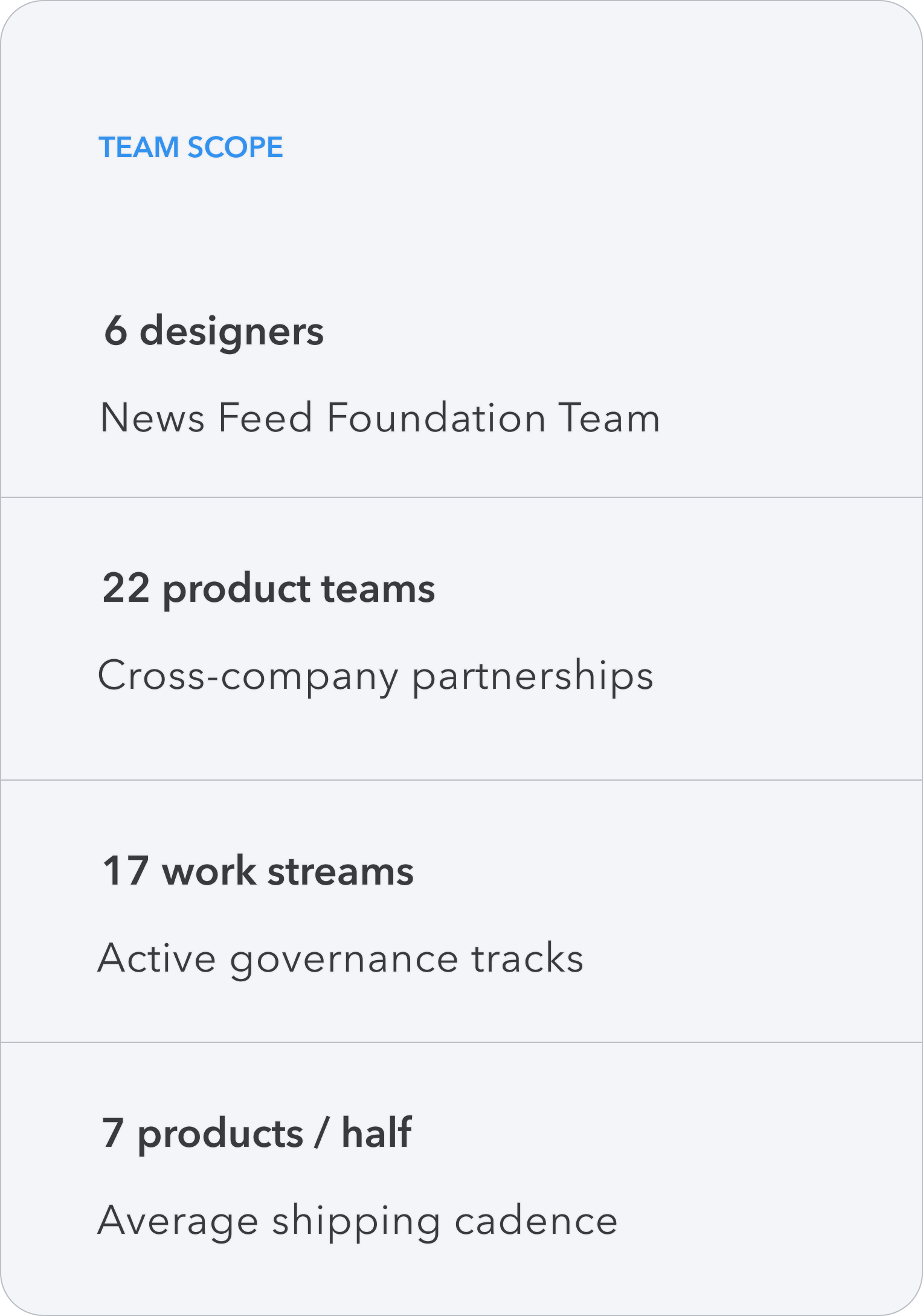 Governing the foundational design system for over 2 billion monthly users — establishing the first-ever governance framework for News Feed and driving org-wide design consistency at global scale.