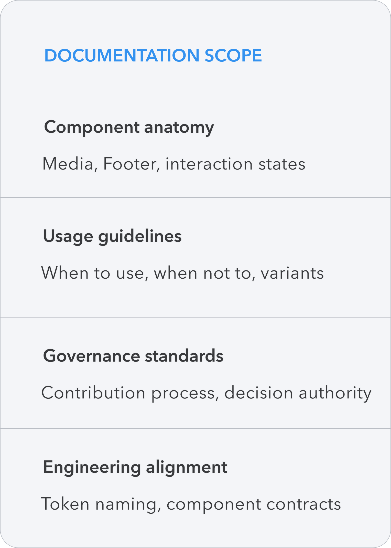 The Attachment component is one example: a deceptively complex pattern used across every surface in News Feed that had never been formally defined. Documenting it meant establishing the canonical model, aligning engineering on naming, and giving product teams a clear framework to build against rather than inventing their own.